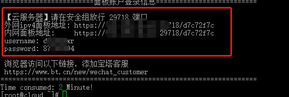 安装完成后,屏幕会显示4行关键信息:(外网面板登录地址,相当于店铺后台入口)、“username”(登录用户名)、“password”(登录密码),一定要截图保存!或者复制到记事本里,丢了就像丢了店铺后台钥匙,很难找回来。