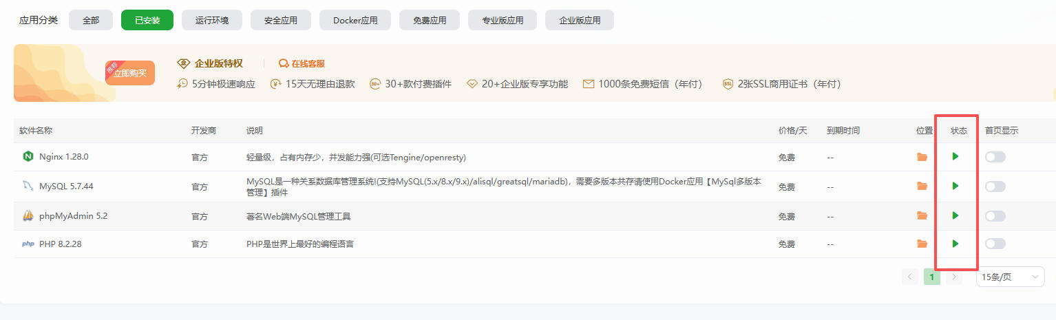安装完成后,回到“软件商店”→“已安装”页面,能看到Nginx、MySQL、PHP phpmyadmin都有显示“已安装”字样,这只是“设备装好了”,如果后面状态是这样的绿三角那说明运行成功,如果不是的话就要点击后面的设置启动一下。