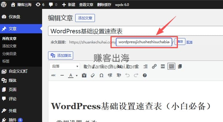 - 中文标题会导致链接出现乱码?发布文章时手动修改“slug”(链接后缀),改成拼音或英文缩写就行(推荐装个Pinyin Slugs插件自动把文章名转成拼音)