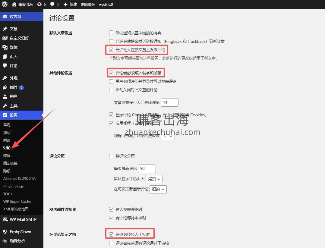 控制文章评论的“游戏规则”,避免垃圾评论刷屏。进入【设置】→【讨论】,按下面的设置来,省心又安全: