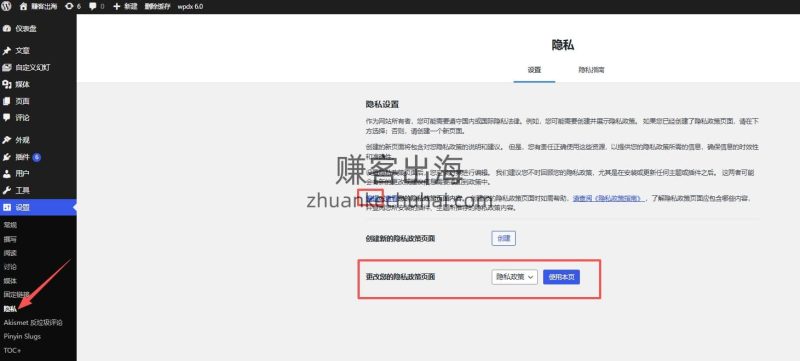 - 回到【设置】→【隐私】,在"隐私政策页面"下拉框选择你刚发布的页面,点【保存更改】
